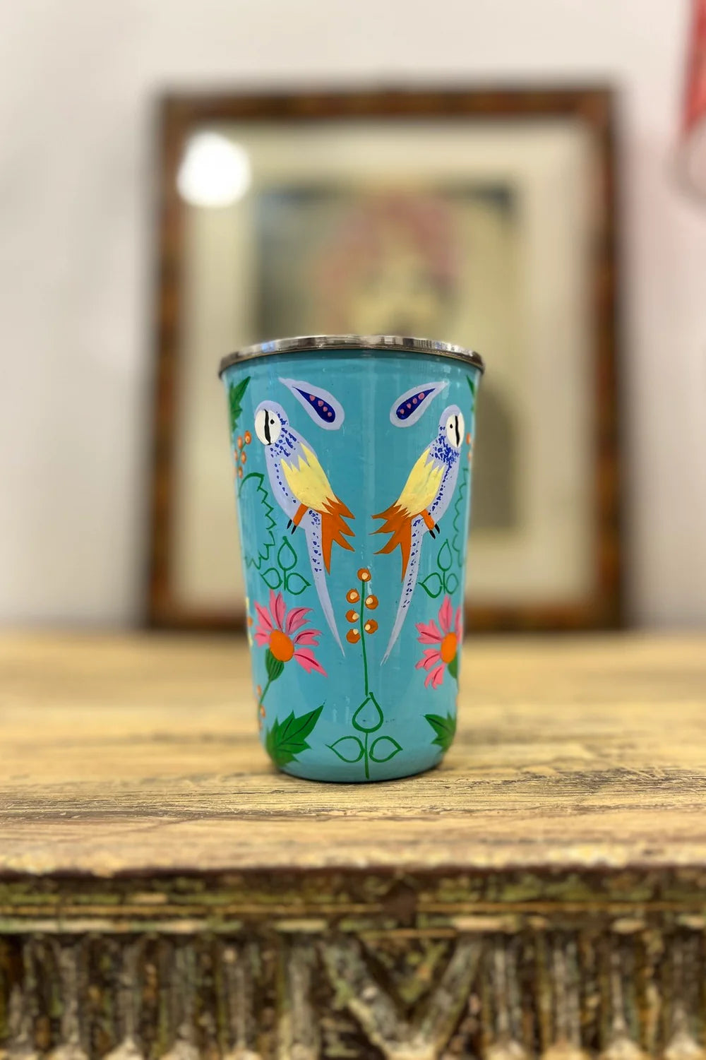 Bicchiere 100% inox smaltato a mano con pappagalli su fondo turchese.