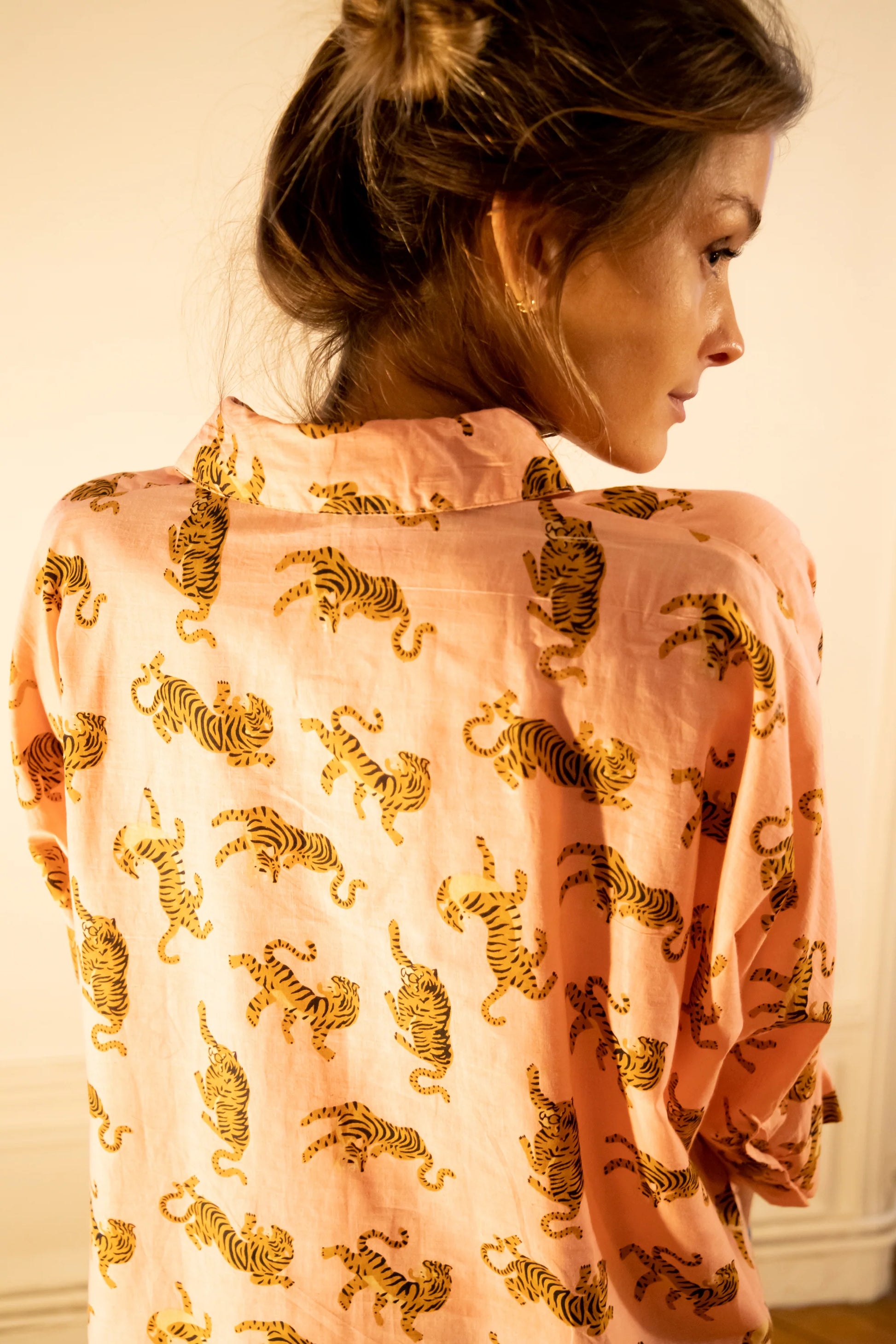 Blusa oversize in cotone fondo rosa e motivo tigri.