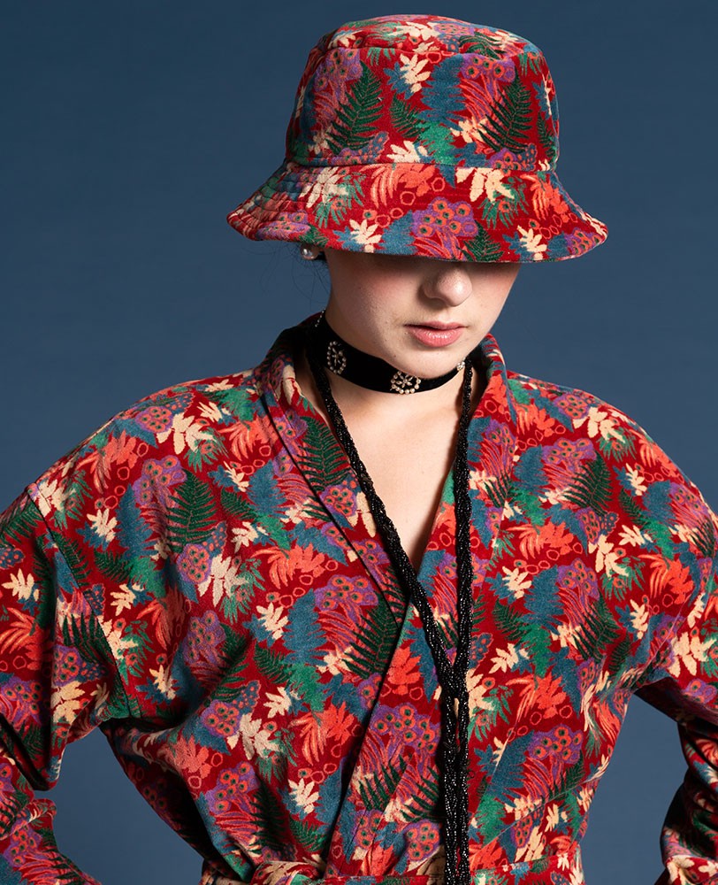 Cappello alla pescatore in velluto stampato con motivo vegetale su fondo rosso scuro.
