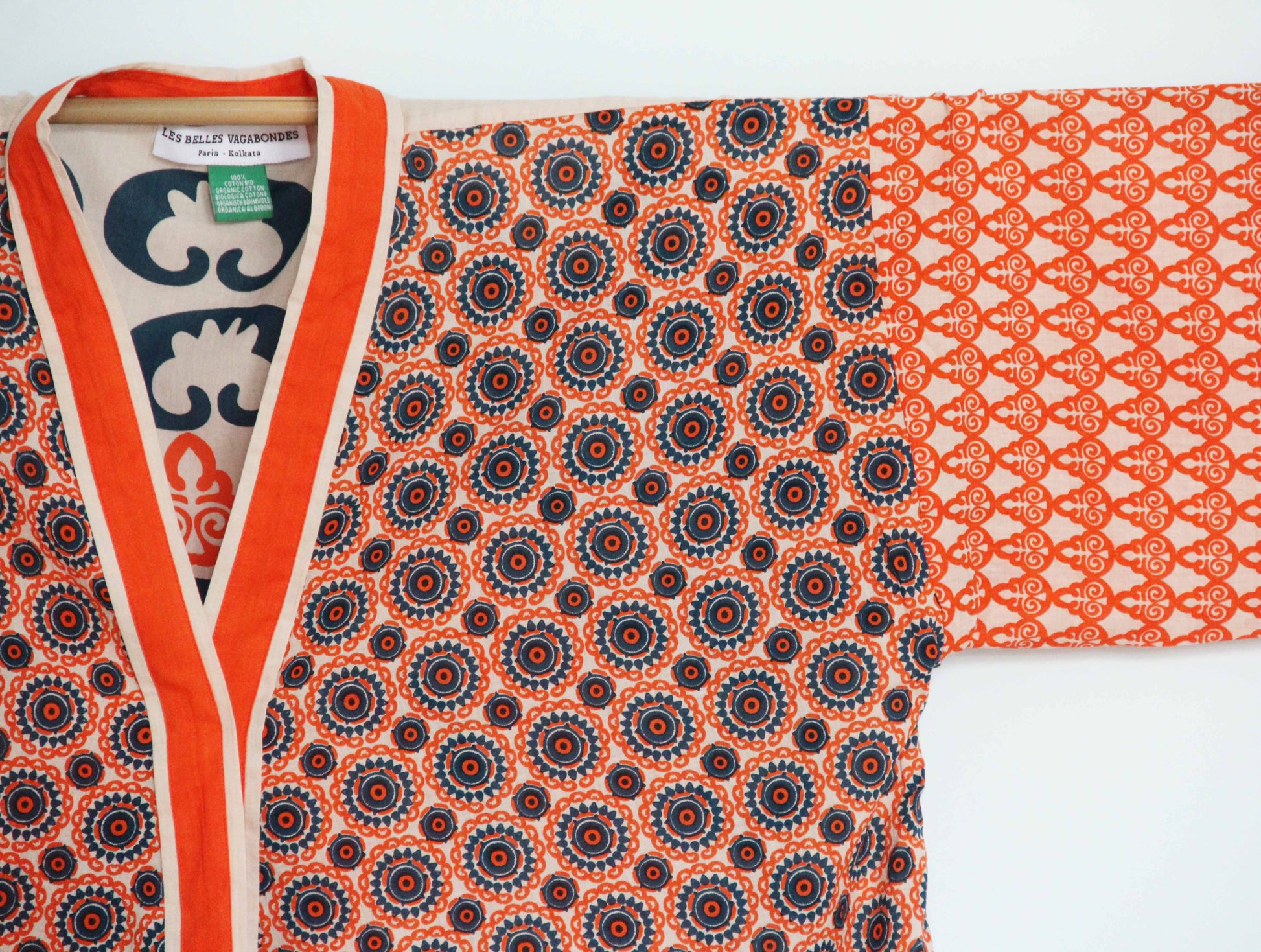 Kimono in soffice e leggero cotone 100% bio, stampato artigianalmente con motivo Suzani arancione.